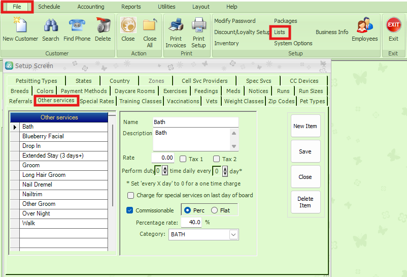 To print a list of Other Services for the day, click on Reports, Lists, Other Services. Choose the date range.